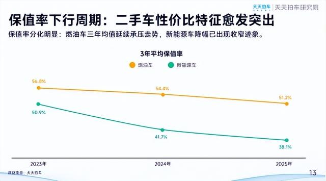 对比近三年数据,新能源车3年平均保值率从2023年的50.9%降至2024年的41.7%,2025年进一步降至38.1%,但降幅已出现收窄迹象;燃油车3年平均保值率则从2023年的56.8%逐年降至2025年的51.2%,延续承压走势。