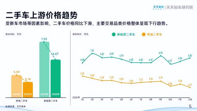 受新车市场“内卷式”竞争传导,2025年二手车市场整体面临价格下行压力。《报告》数据显示,2025年全年新能源二手车成交均价从2024年的7.92万元跌至6.67万元,同比下滑15.8%;燃油二手车成交均价则从2024年的5.59万元降至5.14万元,同比下降8.1%。