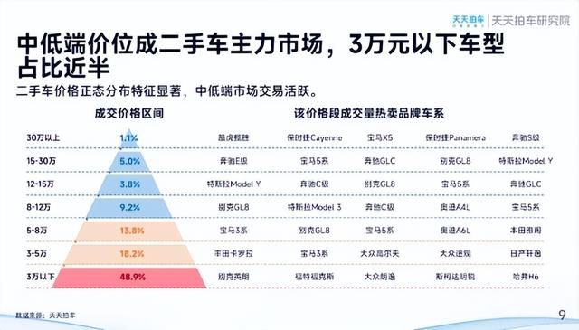价格区间分布呈现显著的“中低端主导”特征。《报告》显示,3万元以下车型成交量占比高达48.9%,成为绝对主力市场;3-5万元价格段占比18.2%,5-8万元价格段占比13.8%,8-12万元价格段占比9.2%,而30万元以上高端车型占比仅1.1%。热门车型中,从交易活跃的别克英朗、福特福克斯、大众朗逸等中低端合资车型,到路虎揽胜、保时捷Cayenne、奔驰E级等高端豪华车型,全面覆盖的交易品类展现了二手车市场的多元化特性。
