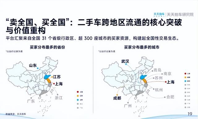 2025年二手车跨区域流通广度和深度继续提升,统一大市场政策红利持续释放。线上化、数字化平台作为重要枢纽,构建起“车尽其用、价尽其值”的流通新格局。《报告》显示,天天拍车已构建覆盖全国31个省级行政区、超300座城市的买家资源网络,跨区域交易成为破解供需错配的核心举措。