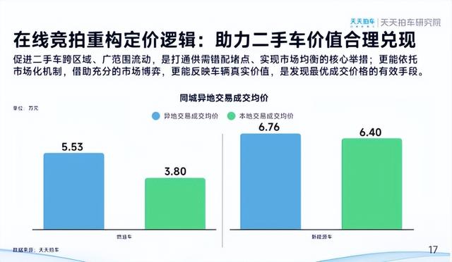价格方面,对比异地交易与本地交易价差明显。2025年燃油二手车本地交易成交均价3.8万元,异地交易成交均价5.53万元;新能源二手车本地交易成交均价6.4万元,异地交易成交均价6.76万元。跨区域流通充分释放了二手车的市场价值,通过天天拍车平台,直连供给端和需求端,哪怕是高龄车或小众车也能凭借在线竞拍模式充分市场博弈,实现二手车价值合理兑现,有效发现车辆最优价值。