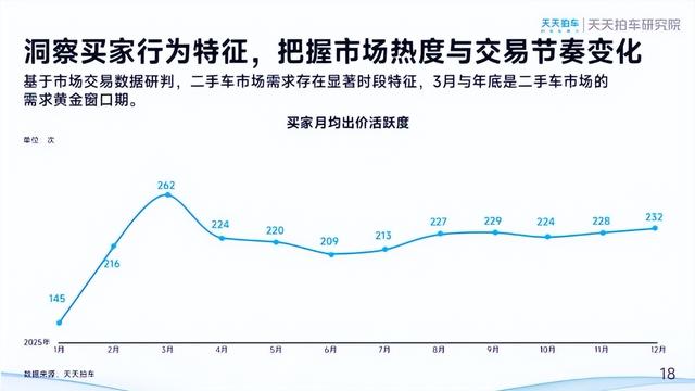 买家活跃度方面,季节性特征显著。2025年3月买家月均出价活跃度达262次,为全年最高;其次,12月出价活跃度232次,这两个时段成为二手车市场需求相对旺盛的窗口期,整体反映出市场需求的季节性波动规律。