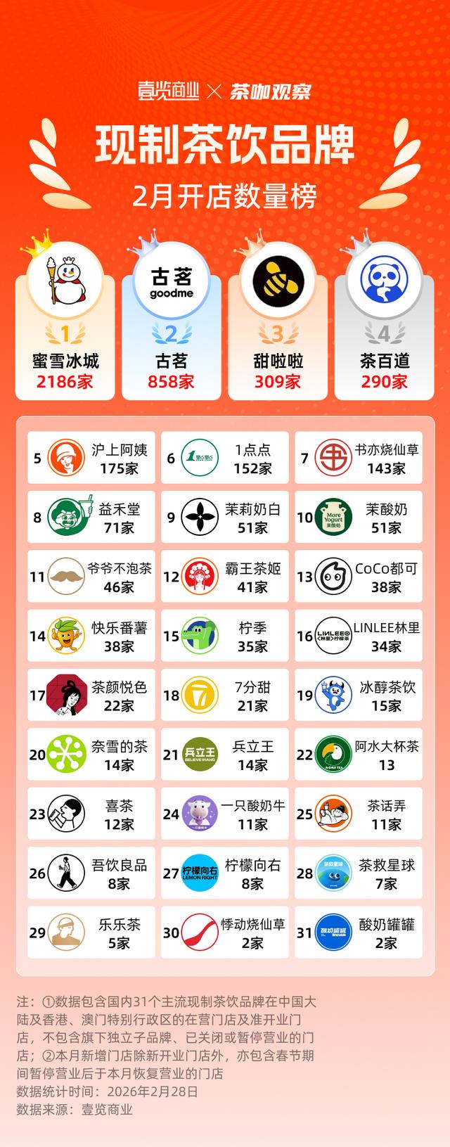 与同行对比,茶颜悦色的扩张节奏更显克制。据壹览商业统计,2026年2月,31个主流现制茶饮品牌中,茶颜悦色2月新增的门店数量排在第17,2月新增门店数量超过100家的有7个品牌,新增门店超过30家的有16个品牌。