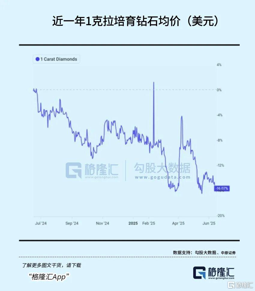 由于印度CVD(化学气相沉积)产能释放,Greenlab等龙头企业新增1100台设备,单厂年产能突破290万克拉,今年上半年,培育钻石价格普遍处于低位。