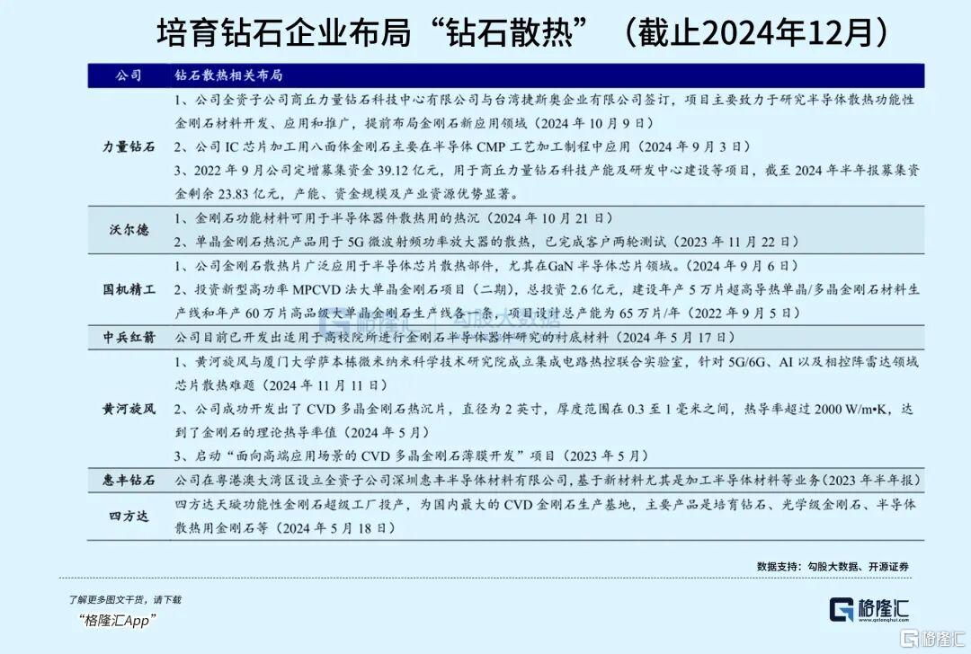 而在培育钻石行业,中兵红箭表示,公司功能金刚石产品可用于半导体、光学、散热、量子等领域。沃尔德也表示,公司重点聚焦金刚石功能性材料在工具级、热沉级、光学级、电子级等方面的研究。