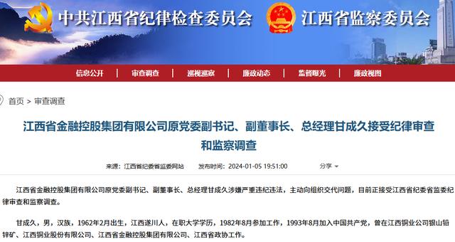 在江西金控系统,这是继2024年原总经理甘成久被查后的又一例高管落马事件,反映出金融反腐在省级金控集团的纵深推进。