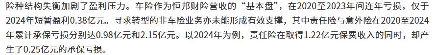 业务结构失衡是恒邦财险承保亏损的重要原因。据《湾财社》报道,车险作为营收的“基本盘”,在2020至2023年间连年亏损,仅于2024年短暂盈利0.38亿元。而寻求转型的非车险业务亦未能形成有效支撑,其中责任险与意外险在2020至2024年累计承保亏损分别达0.98亿元和2.15亿元。