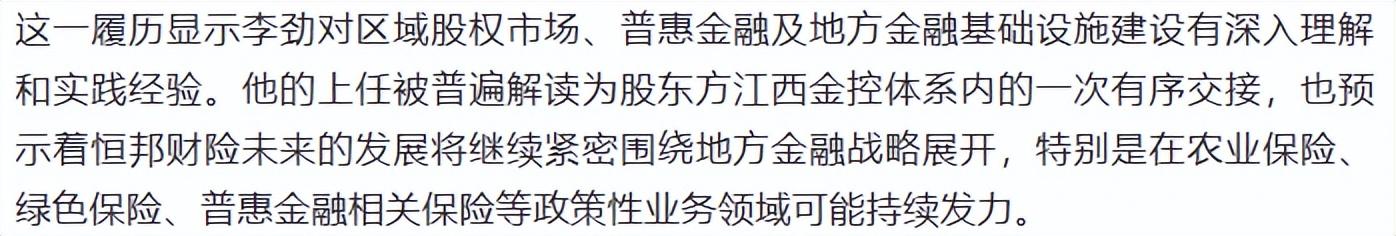 据《华夏时报》报道,李劲的上任被普遍解读为股东方江西金控体系内的一次有序交接,也预示着恒邦财险未来的发展将继续紧密围绕地方金融战略展开。