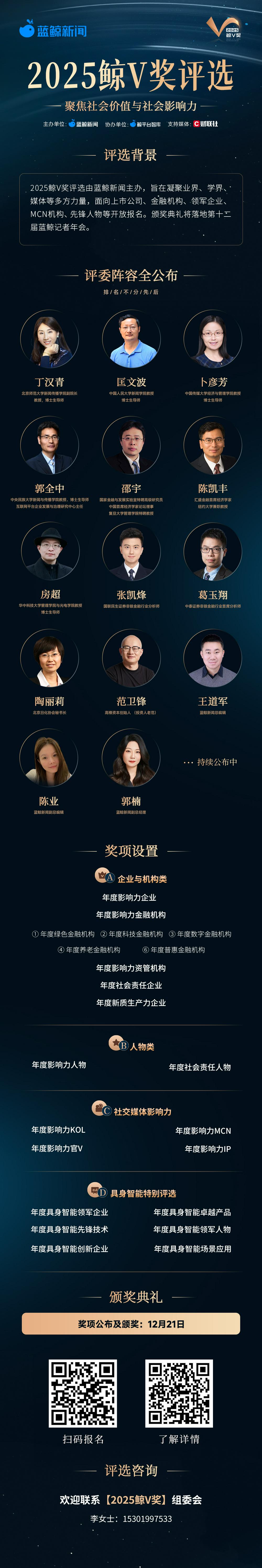 致敬植根于商业理想、绽放于社会土壤的价值创造,2025鲸V奖聚焦社会价值与社会影响力,旨在表彰坚守社会责任、创造社会价值、引领产业向好发展的商业力量,推动形成更具包容性和韧性的经济社会生态。