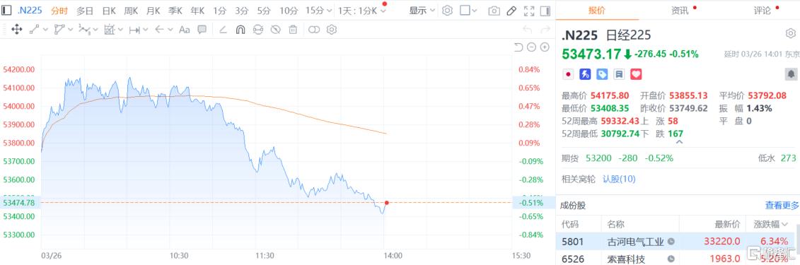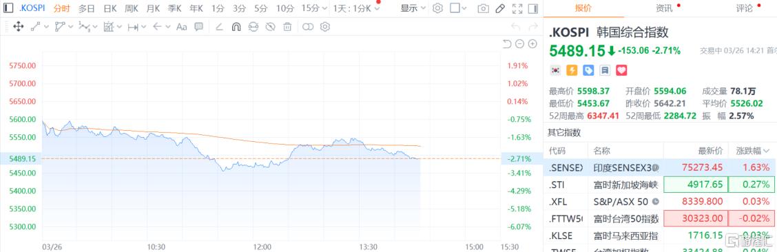 日韩股市皆走低,韩国KOSPI指数日内跌幅达3%,现报5471.47点;日经225指数回吐早前涨幅,目前持平。