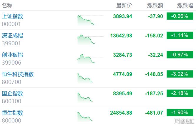 港A股主要指数加速下跌。A股中,沪指跌0.96%跌破3900点,深证成指的与1%,油气股逆势拉涨。港股中,恒生科技指数下挫逾3%,国指跌超2%,恒指跌1.9%,科网股集体下挫,快手跌超13.5%。