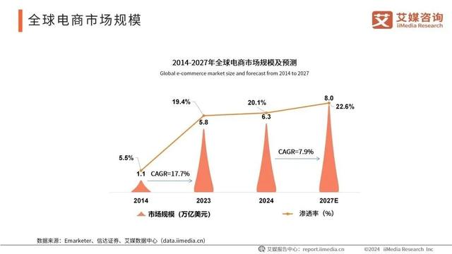 全球电商的结构性窗口正在传出这台发动机的轰鸣。全球平均约20%的渗透率和8万亿美元以上、仍在稳步扩张的市场空间,远远超出外界对电商行业的刻板印象。发达市场有从线下转线上的迁移,新兴市场有人口红利和基础设施完善带来的需求释放,而传统巨头在很多地区的覆盖仍然有限。