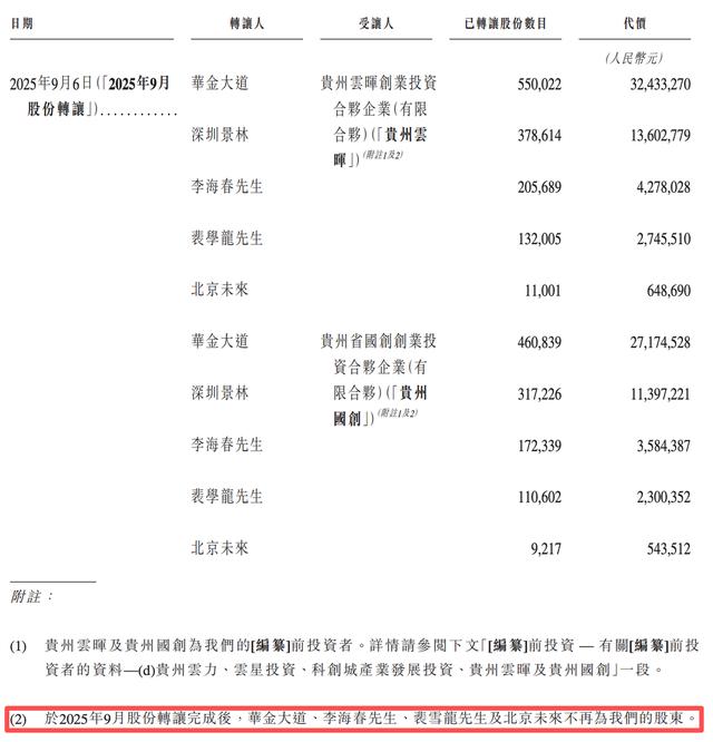 据招股书披露,琥崧科技获得了多轮融资,亦进行了多次股权转让。仅就2025年9月而言,华金大道、深圳景林、李海春、裴学龙、北京未来均分别向贵州云晖、贵州国创向所持琥崧科技的部分股权,合计9870.8万元。