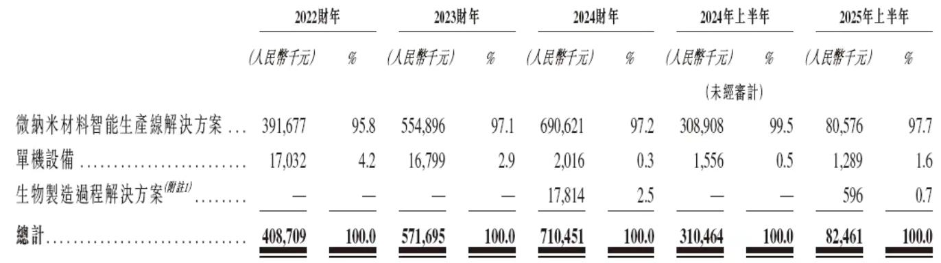 2022年、2023年、2024年度和2025年上半年(即“报告期”),琥崧科技来自微纳米材料智能生产线解决方案的收入分别为3.92亿元、5.55亿元、6.91亿元和8057.6万元,在总收入中的占比分别为95.8%、97.1%、97.2%和97.7%。