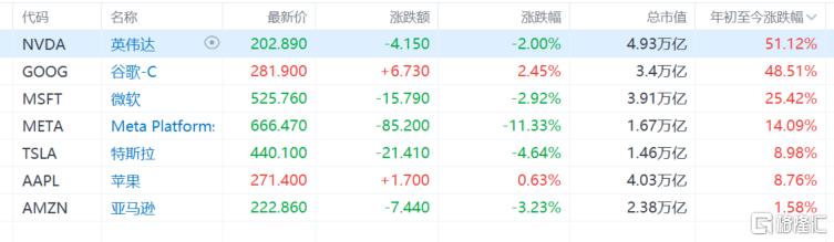 对比来看,英伟达年内累涨51.12%、谷歌48.51%、微软25.42%、Meta14.09%、特斯拉8.98%、苹果8.76%。
