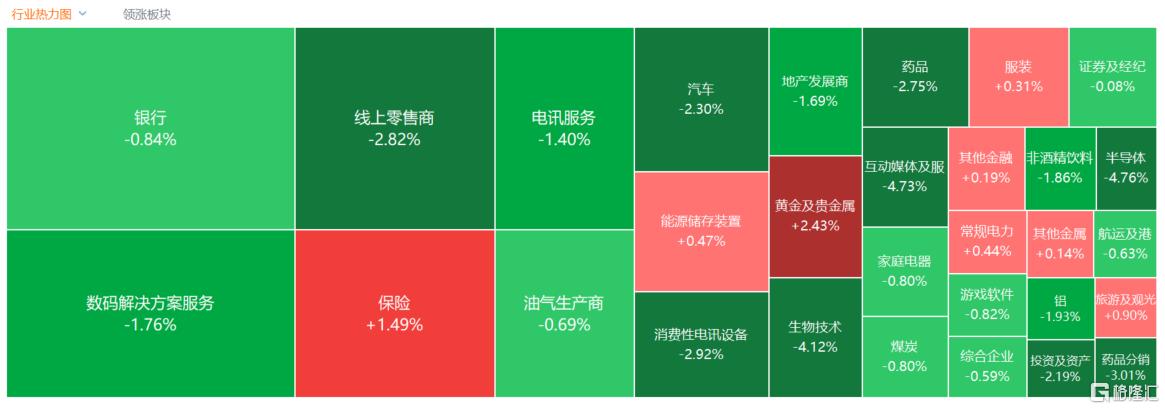 盘面上,作为市场风向标的大型科技股集体下跌拖累大市低迷;半导体芯片股、生物医药股、机器人概念股、濠赌股、汽车股、苹果概念股纷纷走低,权重股中芯国际跌超4%。另一方面,避险情绪升温,黄金价格逼近历史新高,黄金股全天强势,机构预计开门红新单保费和NBV将实现双位数增长,内险股集体走高,消费利好政策持续推出,餐饮股、乳制品股等消费概念股走俏。