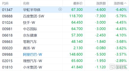 科技股下挫,华虹半导体跌超6%,百度集团跌超5%,快手、中芯国际、京东健康跌超4%,零跑汽车、商汤等跟跌。