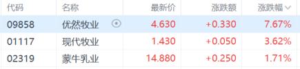 三胎概念股逆势上涨,优然牧业涨超7%,现代牧业涨超3%,蒙牛乳业涨超1%。