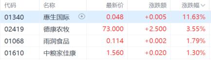 禽畜肉类股表现活跃,惠生国际涨超11%,德康农牧涨超3%,雨润食品、中粮家佳康涨超1%。