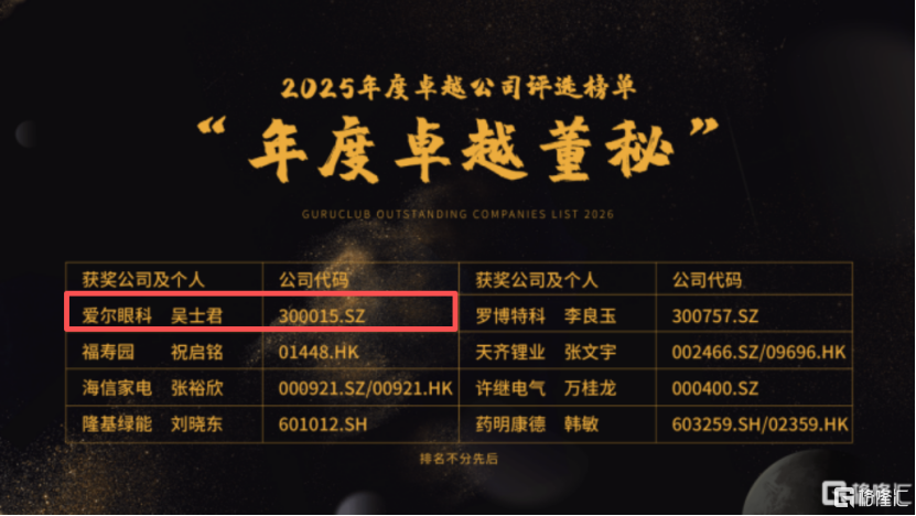 在刚刚公布的格隆汇“金格奖”名单上,爱尔眼科(300015.SZ)同时出现在两个重磅奖项的揭晓时刻:公司获评“年度ESG先锋奖(大市值)”,董事会秘书吴士君荣获“年度卓越董秘”。