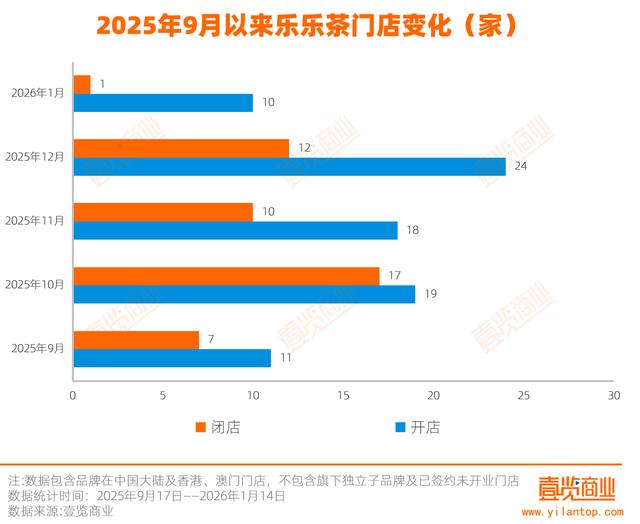 而据茶咖观察统计,2025年9月中旬至2026年1月14日,乐乐茶新开82家门店,关闭47家门店,截至1月14日,乐乐茶全国门店数量为456家,与这一目标存在差距,扩张步伐较预期更为审慎。