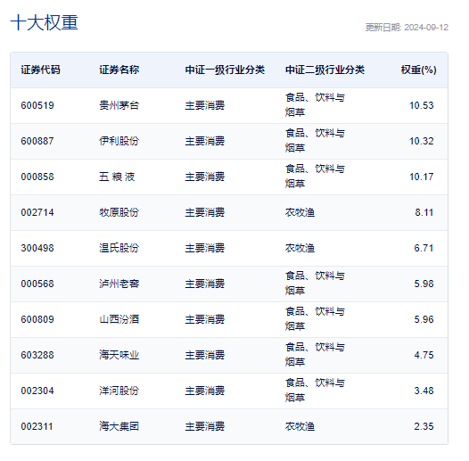 规模最大、流动性最佳的消费ETF(159928)跟踪中证主要消费指数(000932),成份股42只,作为消费大板块中的刚需、内需属性板块,具有明显的穿越经济周期的盈利韧性,指数成分股覆盖人们日常生活必须的消费品。前十大囊括白酒、乳制品、畜牧养殖、调味品行业龙头,截至9月12日,前十大成分股权重占比高达68.37%,其中5只白酒龙头股(贵州茅台、五粮液、泸州老窖、山西汾酒、洋河股份)共占比36.12%,养猪大户牧原股份、温氏股份占比14.82%,,其他权重股还包括:乳制品龙头伊利股份(10.32%),调味品龙头海天味业(4.75%),和饲料龙头海大集团(2.35%)。