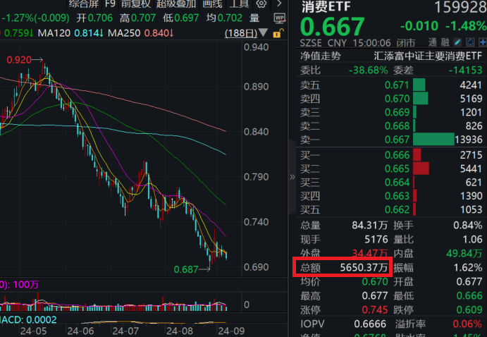 对应的热门ETF方面,规模最大的消费ETF(159928)今日震荡下行,收跌1.48%,创2020年2月以来新低!全天成交额超5600万元,交投高居同类第一。最新基金规模近68亿元,同样稳居同类第一!