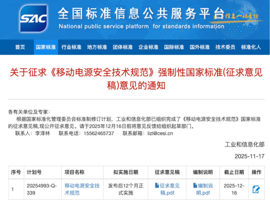 今年10月-11月,工信部多次组织召开《移动电源安全技术规范》征求意见稿研讨会。据参会人员透露,目前标准已基本定稿,预计会在2026年2月正式发布,同年6月起实施。