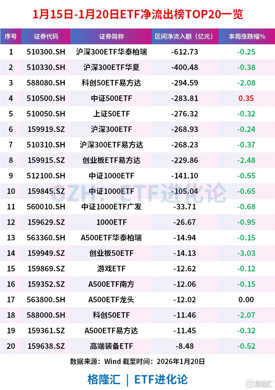 自上周四以来,宽基指数ETF大幅净流出3057亿元,其中沪深300ETF华泰柏瑞、沪深300ETF华夏和科创50ETF易方达分别净流出612亿元、400亿和294亿元。