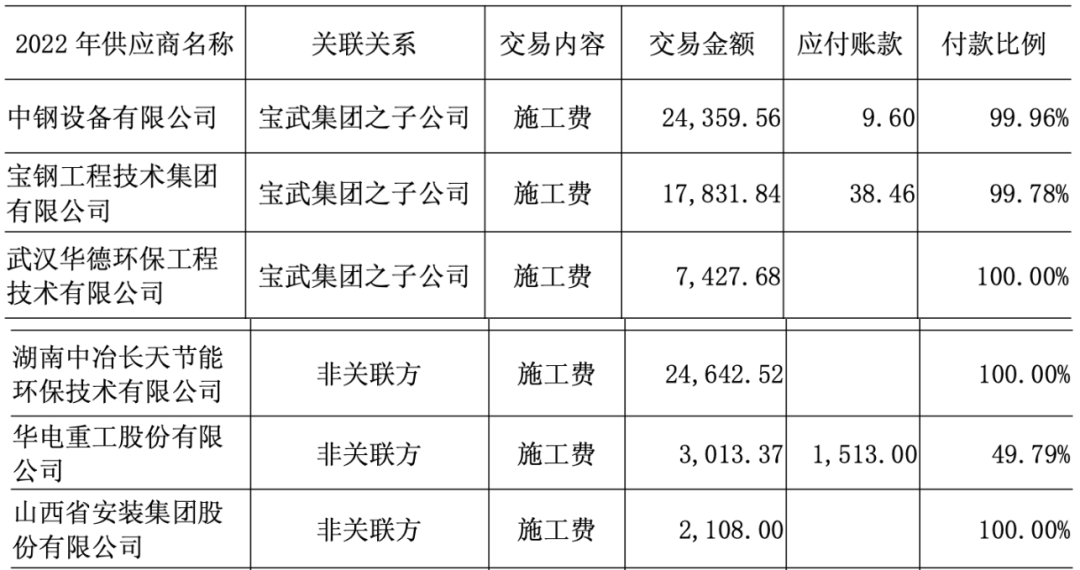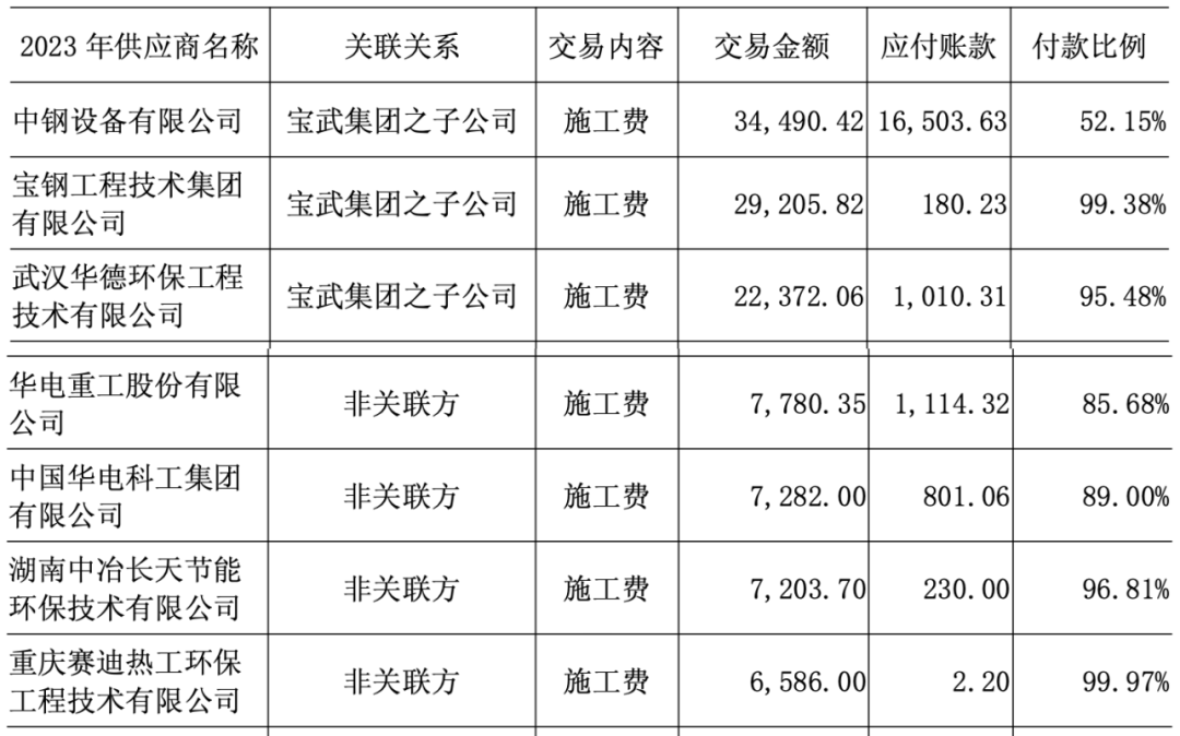 然而,上市公司披露的在建工程前十大供应商的期末应付账款余额却并不高。2022年和2023年最大的在建工程关联方与非关联方供应商交易金额与应付账款余额如下: