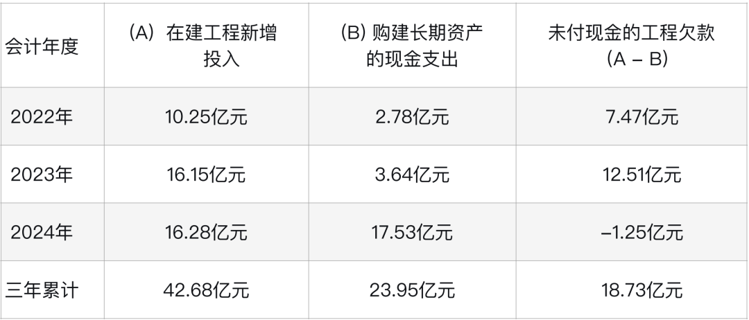 2022-2023年,八一钢铁通过大量确认“在建工程”资产(累计26.4亿),但实际仅支付了少量现金(累计6.42亿),积累了高达约20亿元的应付工程款等债务。