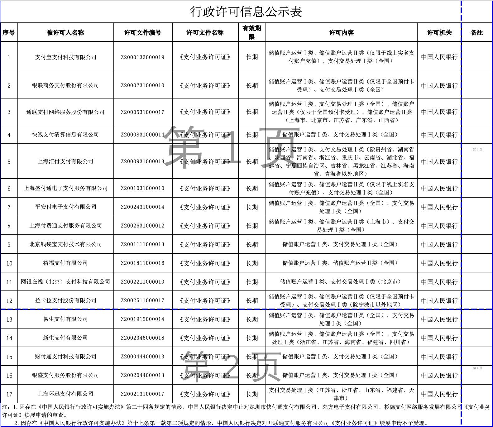 包括支付宝、银联商务、通联支付、快钱支付、上海汇付等共17家支付机构完成牌照续展,支付牌照有效期由5年变更为长期。