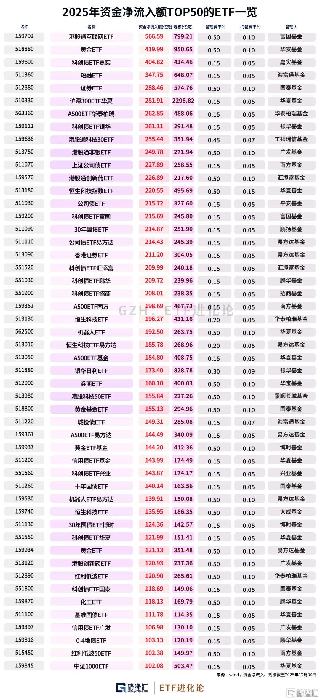 ETF资金榜单,聚焦港股、黄金、证券的ETF成为年度“吸金王”;科创债ETF脱颖而出。