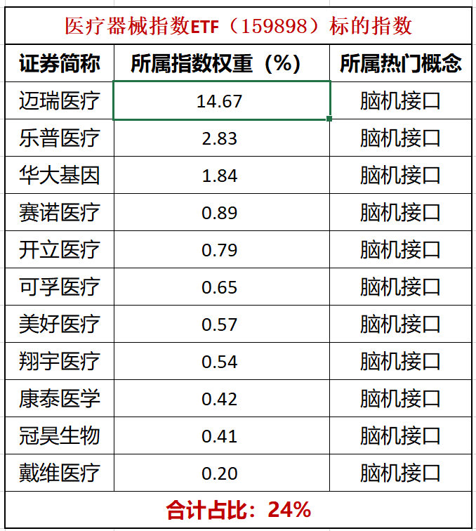 目前A股市场里,纯正的“脑机接口”标的凤毛麟角。医疗器械指数ETF(159898)所跟踪的指数中,包含了约24%在脑机接口领域有实质性业务布局的上市公司,直接提供了一个高效、便捷的指数化工具,可以布局脑机接口这一前沿赛道。