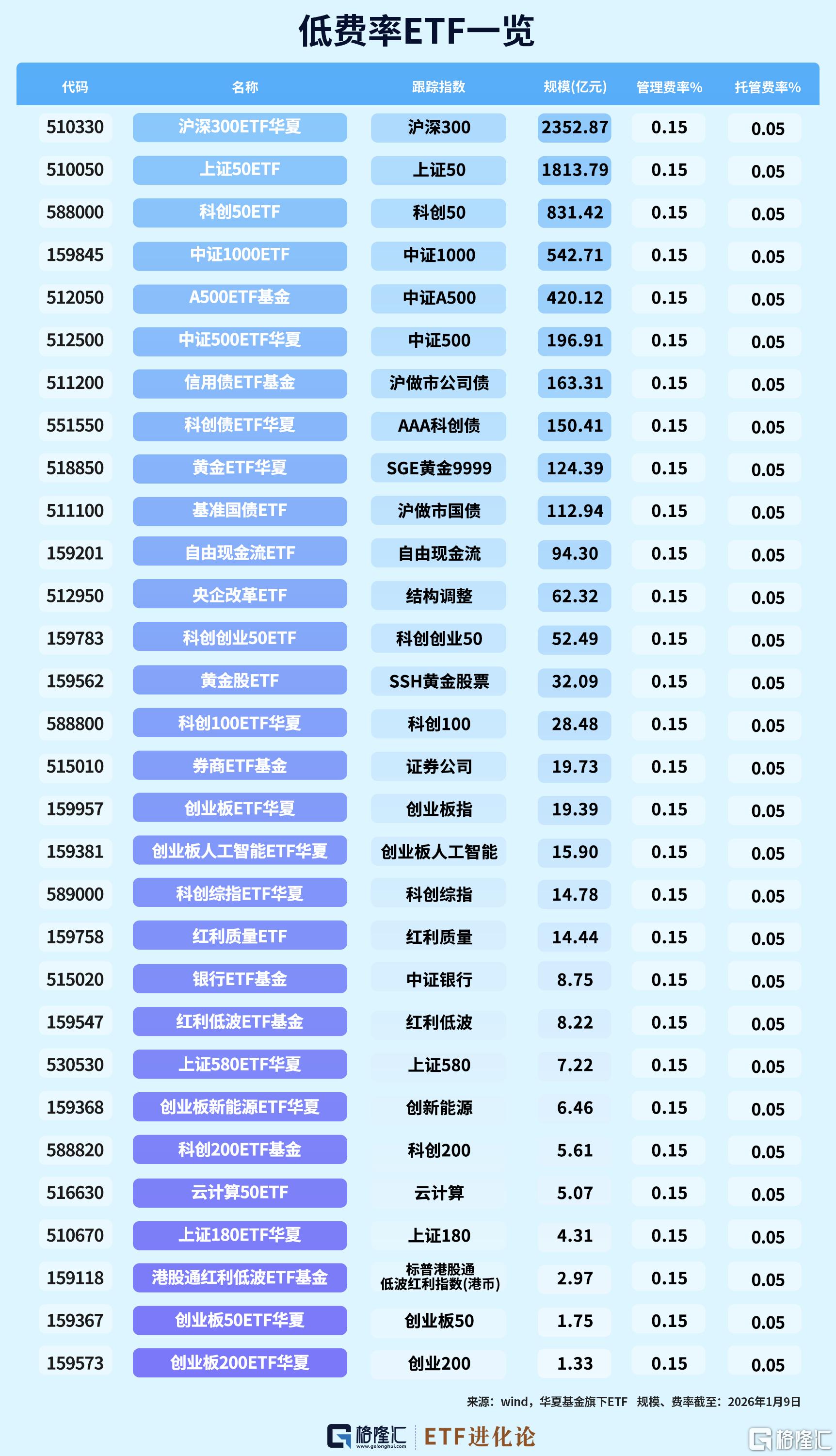 此外,市场热门ETF黄金ETF华夏(518850)、黄金股ETF(159562)、自由现金流ETF(159201)等费率也是最低费率。
