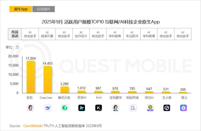 另外,QuestMobile公布的数据显示,若对比AI原生应用的月活规模,文心和同行并不在一个维度。以2025年9月为例,彼时阿里千问尚未发力C端,豆包和DeepSeek已经是亿级量级,腾讯元宝也远远甩开文心一言。