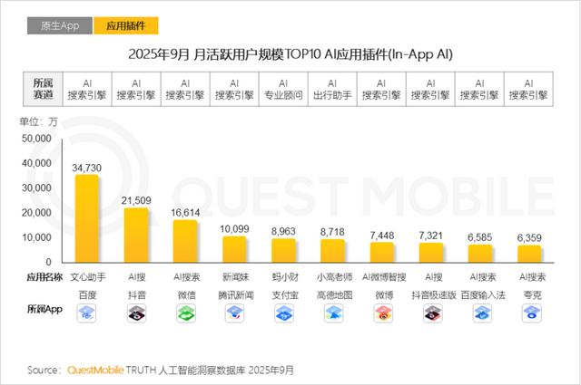 但若把文心助手看作百度的一个AI应用插件,它的竞争力就一下子上来了:文心助手的月活遥遥领先于抖音、微信、支付宝等App的内置应用插件。