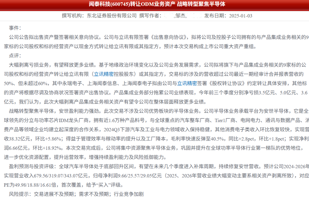 今年1月初,也就是在被上海警方刑拘前不久,邹杰以东北证券研究员身份联合发布题为《闻泰科技(600745)转让ODM业务资产 战略转型聚焦半导体》的点评报告。