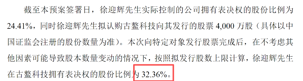 本次向特定对象发行股票完成后,在不考虑其他因素可能导致股本数量变动的情况下,按照拟发行股数上限计算,徐迎辉在古鳌科技拥有表决权的股份比例为32.36%。