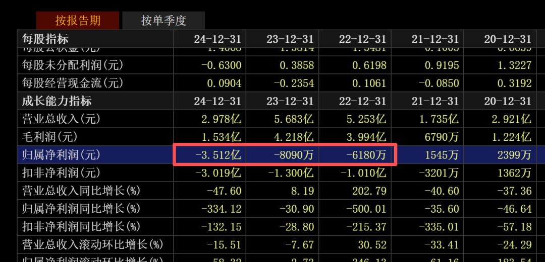 业绩方面,截至2024年底,公司已连亏三年,且亏损幅度不断增大。