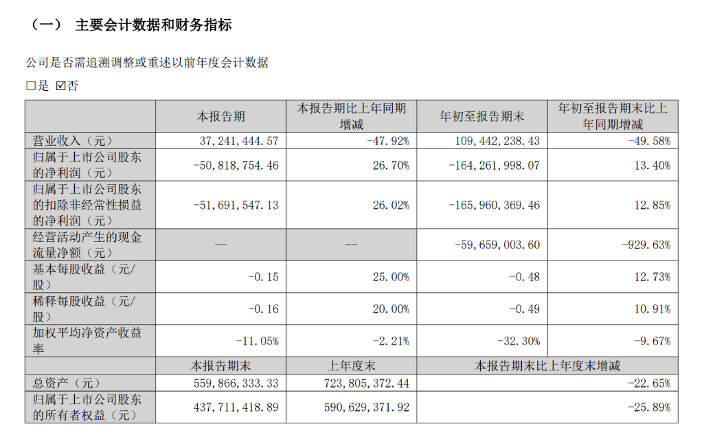 2025年三季报显示,古鳌科技前三季度实现营业收入为1.09亿元,同比下降49.58%;净利润为-1.64亿元。第三季度,公司实现营业收入3724.14万元,同比下降47.92%;归母净利润为-5081.88万元。