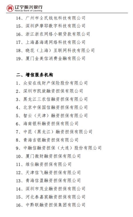 从已披露的信息来看,振兴银行的合作网络包括19家平台运营机构和33家增信服务机构。其中,平台运营机构涵盖多家知名互联网企业旗下的持牌金融机构,融资担保公司等增信机构也位列其中。