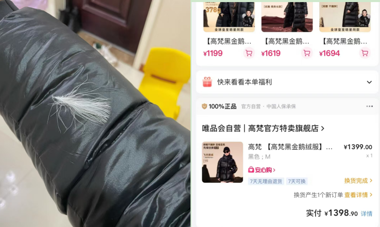 价格越来越贵,高梵也遭到不少消费者的质疑。“花了1399元在唯品会买了一件高梵黑金3.0羽绒服,穿了4天(就)开始跑绒、不光走线处跑绒、面料平整处也有钻绒现象。”一名消费者向时代周报记者表示。