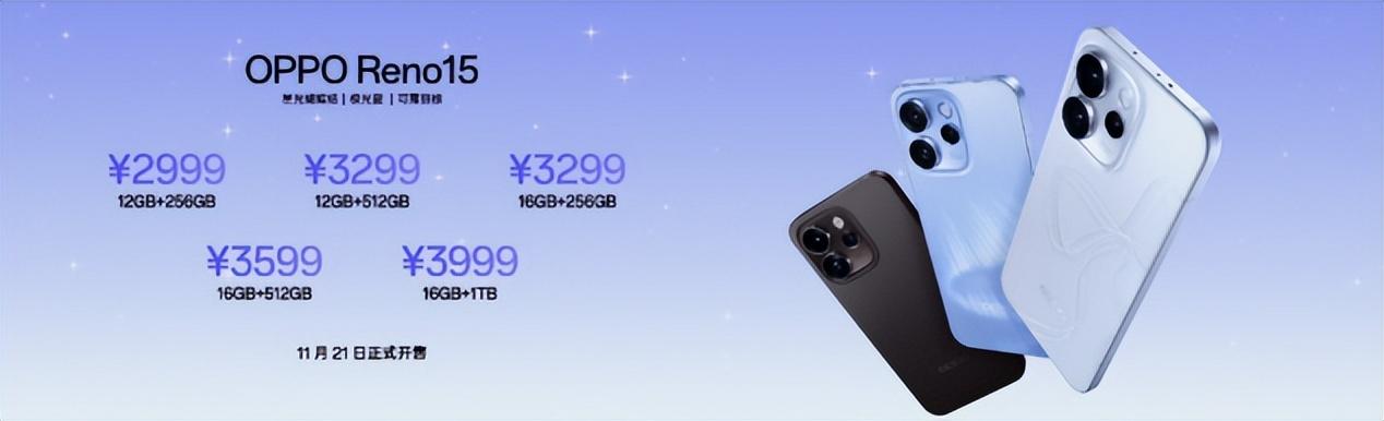 Reno15 提供星光蝴蝶结、极光蓝、可露丽棕三种配色,12GB+256GB 版本定价 2999 元;12GB+512GB 版本定价 3299 元;16GB+256GB 版本定价 3299元;16GB+512GB 版本定价 3599 元;16GB+1TB版本定价 3999元。