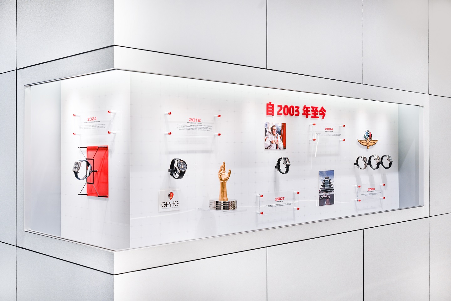压轴篇章以品牌第四代掌门人杰克•豪雅(Jack Heuer)的格言“时间永不停止,我们亦永不止步”为序幕,展区呈现泰格豪雅自2022至2024年对“先锋制表”(Avant-Garde Horlogerie)理念的持续探索。2024年推出的巅峰之作——摩纳哥系列双秒追针计时码表,搭载品牌与顶级机芯厂Vaucher联合研发的TH81-00全钛金属机芯。通过结构性运用5级钛金属与蓝宝石水晶,腕表营造出极具通透感的视觉效果;机芯经手工精细打磨,饰以品牌专属棋盘格纹,成为泰格豪雅历史上首枚机械双秒追针计时码表。