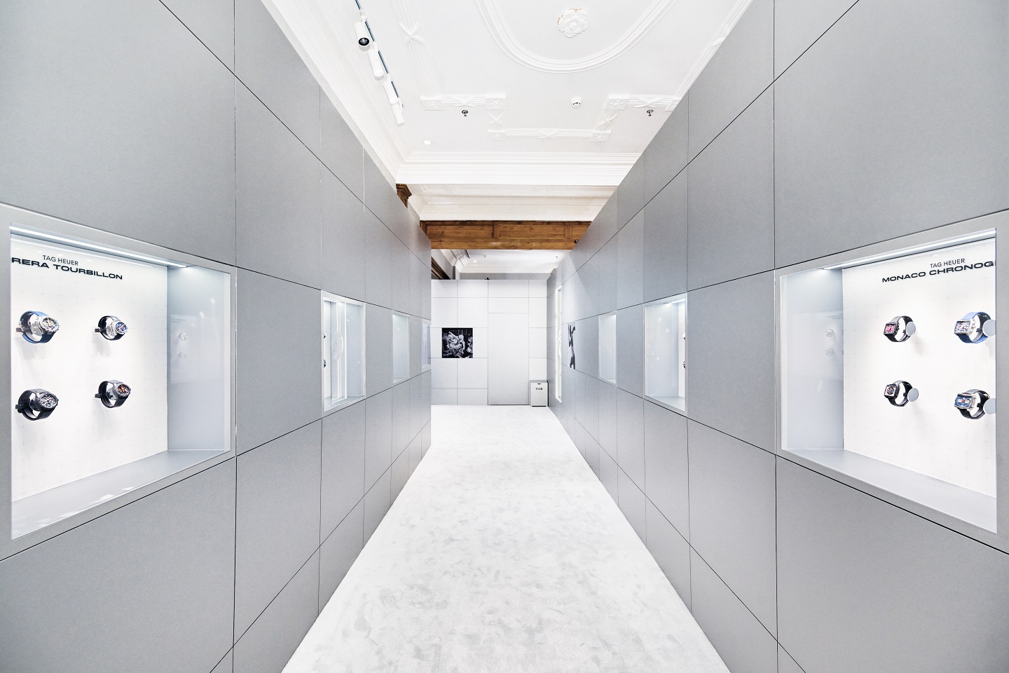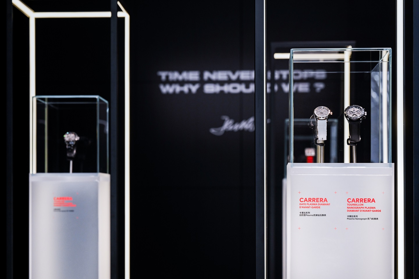 在当代展厅空间中,泰格豪雅卡莱拉(Carrera)系列与摩纳哥(Monaco)系列始终是品牌身份的核心支柱。本展区的一大亮点,是首次全面呈现品牌陀飞轮计时腕表系列,充分展现泰格豪雅在复杂机械制表领域的造诣。