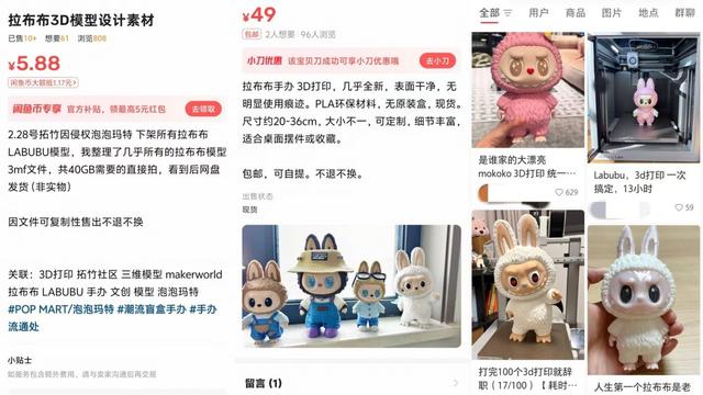 在小红书等社交平台上,实现“Labubu自由”成为3D打印爱好者们津津乐道的话题,甚至有商家公然售卖图纸和盗版手办牟利。这条灰色产业链上的每一环,都在挑战泡泡玛特原创IP的溢价逻辑和版权底线。