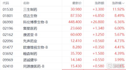 港股创新药板块同样涨幅居前,截至发稿,三生制药涨近12%,信达生物、复星医药、康诺亚、先声药业等个股同步上扬。