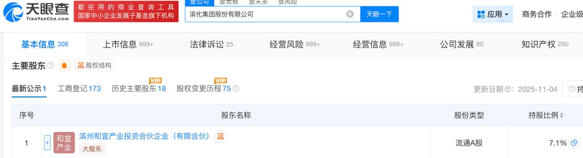 天眼查App信息显示,滨化股份成立于1998年5月,位于山东省滨州市。目前,该公司的注册资本约为20.57亿元,法定代表人为董红波,主要股东包括滨州和宜产业投资合伙企业(有限合伙)(下称“滨州和宜”)等。