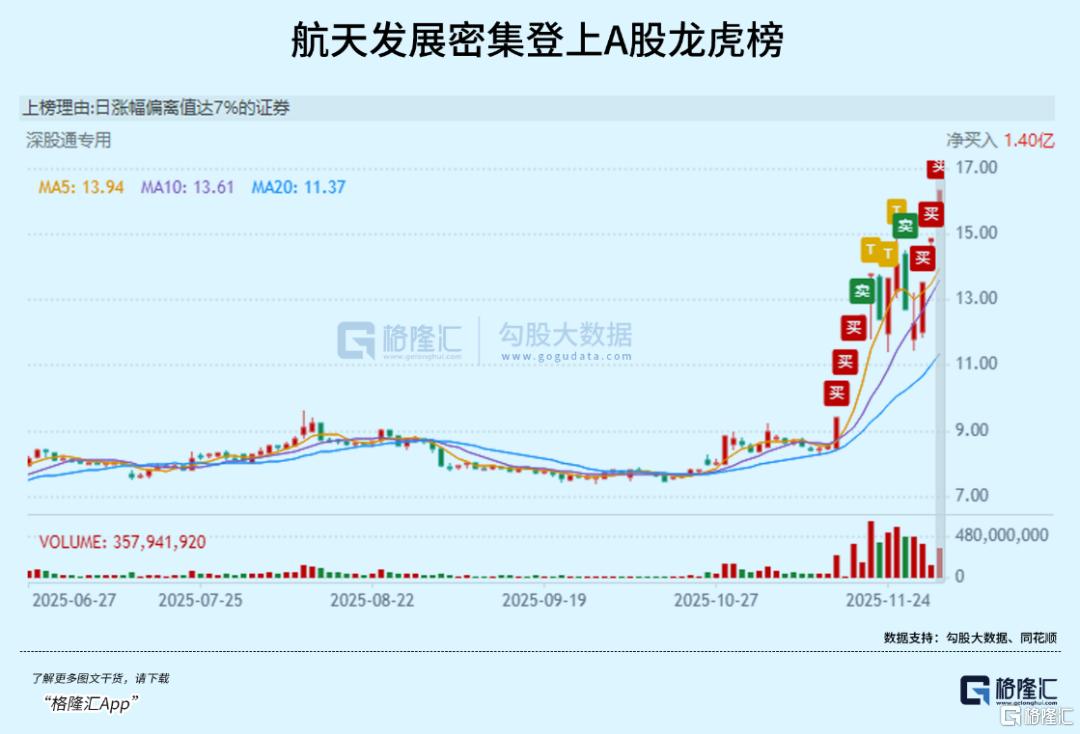 行情数据显示,自从航天发展的股价从11月14日首次涨停之后,该股就开始频频出现大量知名游资机构参与的身影,在众多资金轮炒之下,该股目前已有超10次登入龙虎榜。
